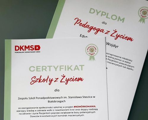 Fundacja DKMS przekazała podziękowania za wsparcie i przyznała naszej szkole już po raz kolejny Certyfikat Szkoły z Życiem za zaangażowanie społeczności szkolnej w projekt #KOMÓRKOMANIA, szerzący wiedzę w zakresie walki z nowotworami krwi oraz dający nadzieję na zdrowie i życie Pacjentom poprzez zwiększenie bazy potencjalnych Dawców krwiotwórczych komórek macierzystych. (więcej…)