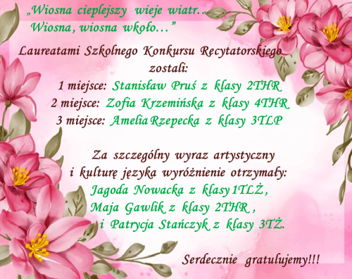 W ramach wiosennych fascynacji literackich w dniu 20 marca 2025 roku odbył się Konkurs Recytatorski, który w naszej szkole ma już ponad trzydziestoletnią tradycję. W wyjątkowej atmosferze, pełnej magii i piękna ojczystego słowa, wysłuchano interpretacji wielu różnorodnych utworów poetyckich oraz fragmentów prozy. Do konkursu przystąpiło 10 uczestników. (więcej…)