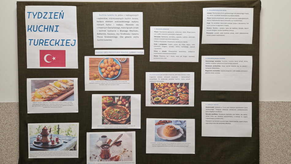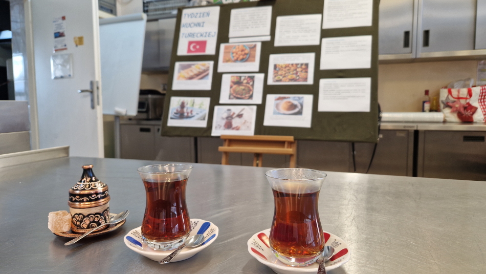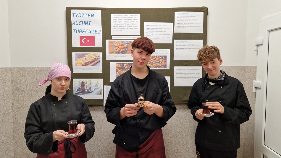 Pod koniec listopada w naszej szkole zapachniało aromatycznymi przyprawami, wyjątkowymi deserami i głównymi daniami pochodzącymi z Turcji. Uczniowie klas Technikum Żywienia i Usług Gastronomicznych mieli możliwość wziąć udział w niezwykłych zajęciach, na których poznali ciekawe smaki, dania, przepisy. Tydzień kuchni tureckiej był realizacją części podstawy programowej odnoszącej się do poznawania kuchni różnych narodów.
