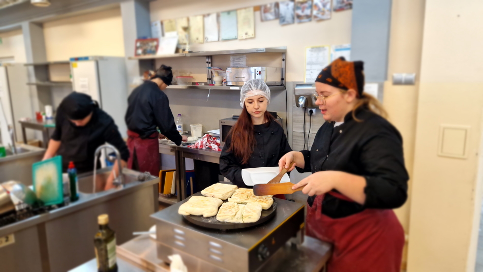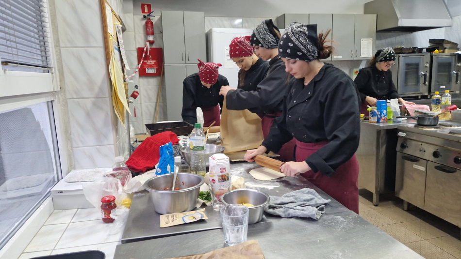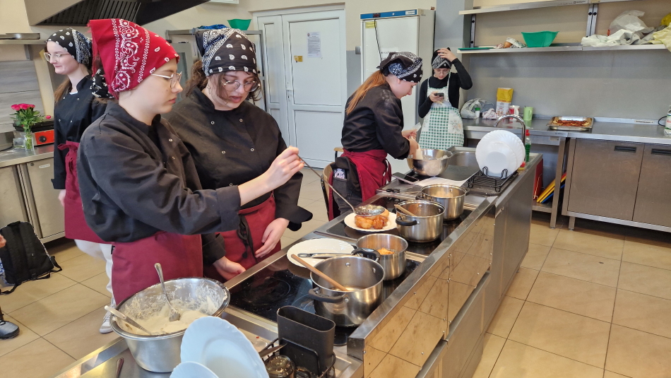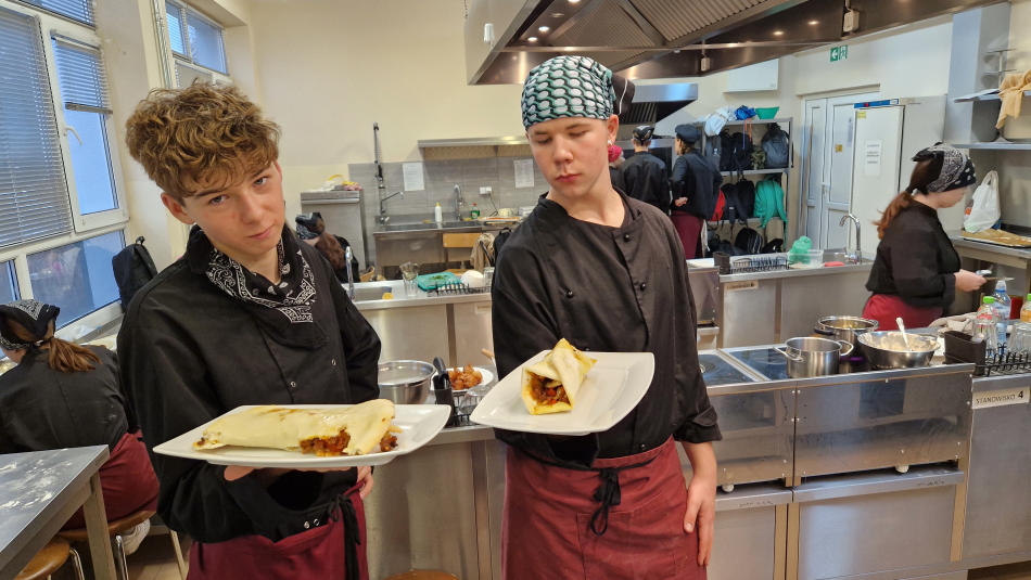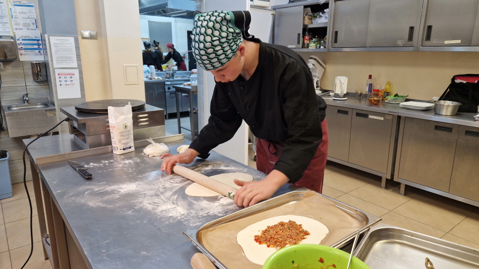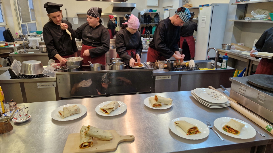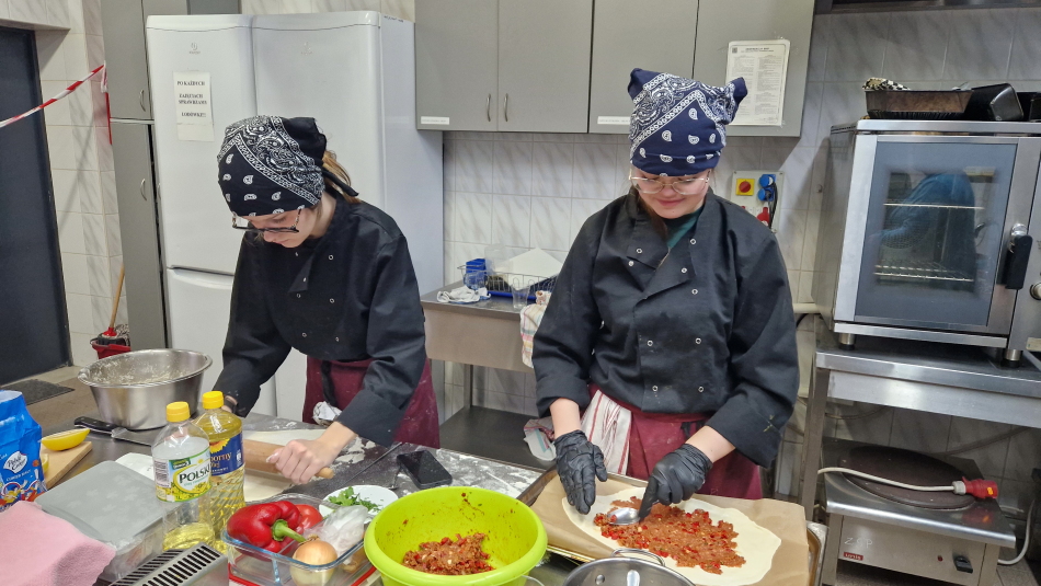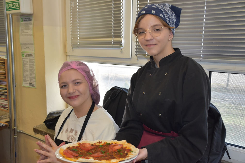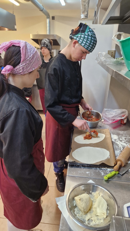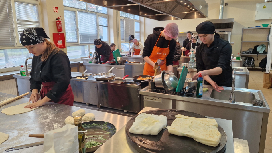 Uczniowie doskonalili umiejętności pracy z przyprawami, m.in. pul biber, papryka wędzona, a także techniki formowania i smażenia ciasta oraz przygotowywania nadzienia do potraw. Wspólne gotowanie sprzyjało doskonaleniu umiejętności współpracy i kreatywności, a końcowa degustacja stała się okazją do wymiany wrażeń i rozmów o możliwościach zastosowania poznanych przepisów w praktyce gastronomicznej.