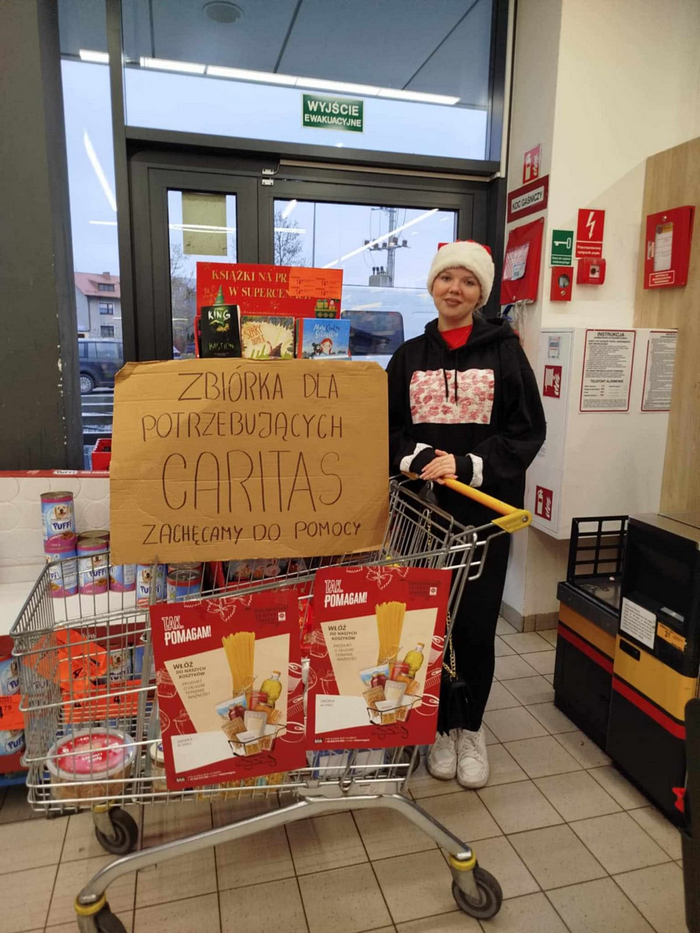 Jak co roku uczniowie Zespołu Szkół Ponadpodstawowych odpowiedzieli pozytywnie na prośbę Dyrektora Caritasu PARAFII Białobrzegi i wzięli udział w świątecznej akcji zbiórki żywności dla potrzebujących. Uczennice z klasy III TŻ i uczniowie z klasy IIITHR, stawili się do siedmiu wyznaczonych sklepów, zachęcając kupujących do kupna dodatkowych produktów a tym samym dokonania uczynku miłosierdzia, do których wzywa czas Adwentu.