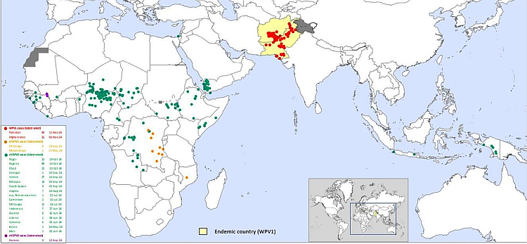 Ryc. 1 Mapa występowania przypadków polio wywołanych WPV1 oraz cVDPV w okresie ostatnich 12 miesięcy.