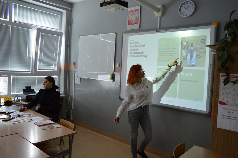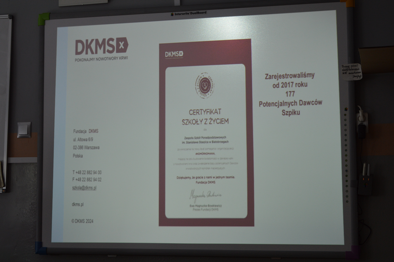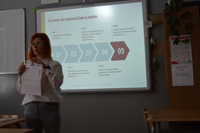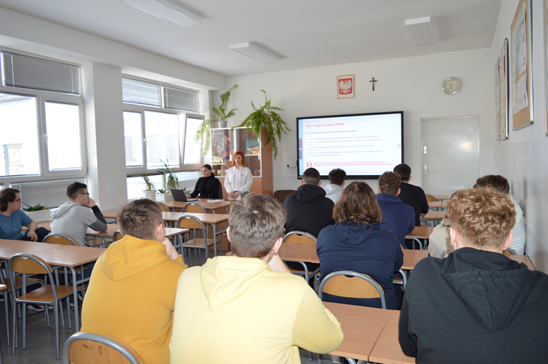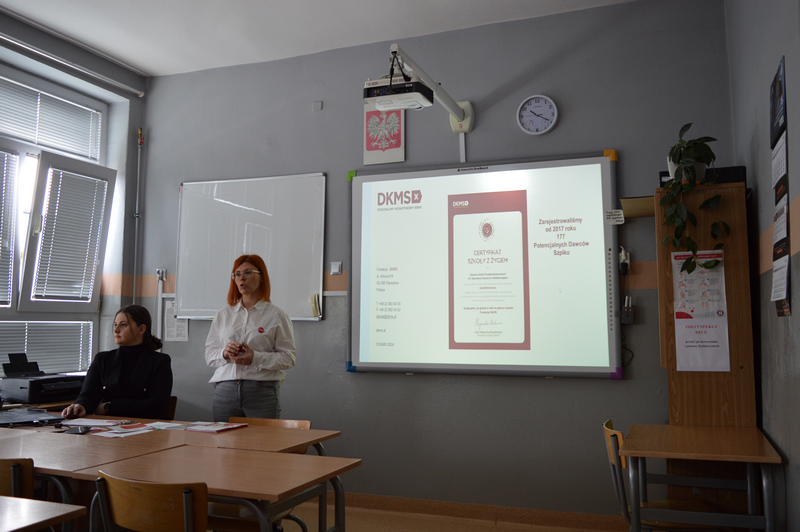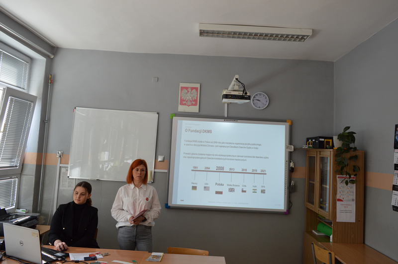 Na początku kwietnia szkolny koordynator DKMS pani Edyta Wojdyr przeprowadziła zajęcia edukacyjne dla pełnoletnich uczniów naszej szkoły, podczas których zostali oni zapoznani z historią powstania Fundacji DKMS, statystykami dotyczącymi dawców w kraju i na świecie, ale przede wszystkim uzyskali informacje na temat kryteriów bycia dawcą i metod pobierania materiału genetycznego. Szczegółowo omówiono przebieg rejestracji, metody pobrania, a także obalone zostały mity krążące wokół tematyki dawstwa szpiku.