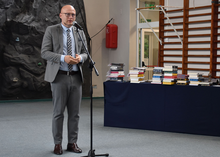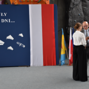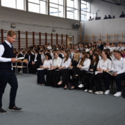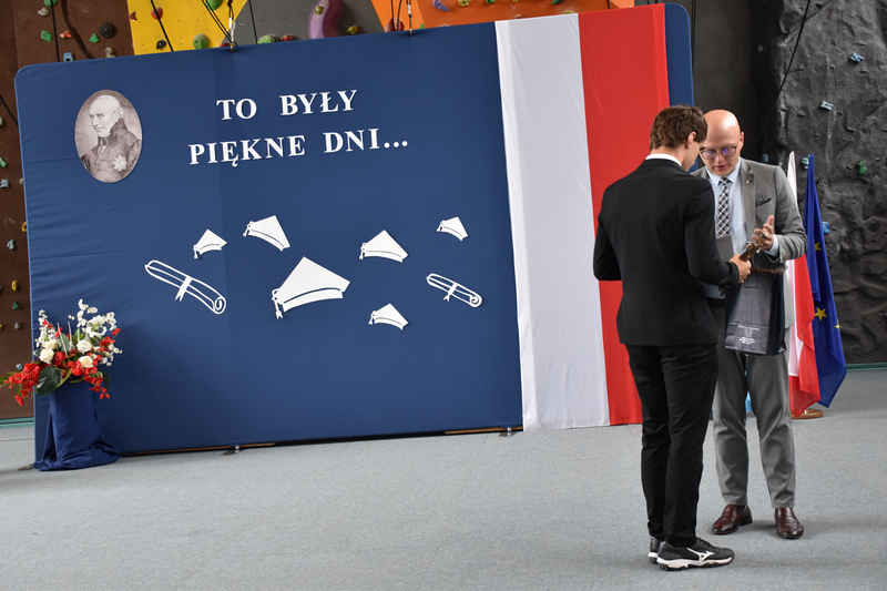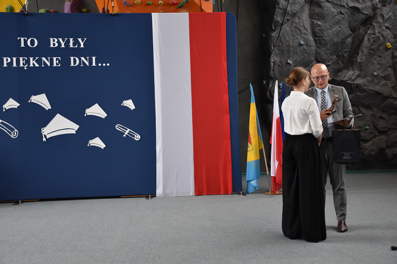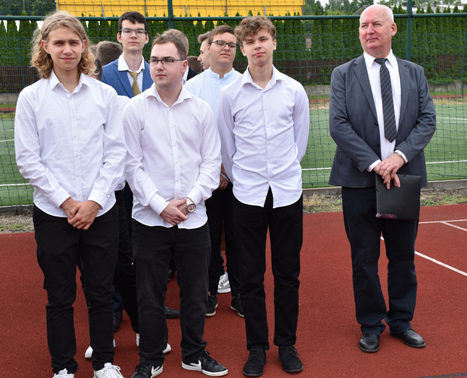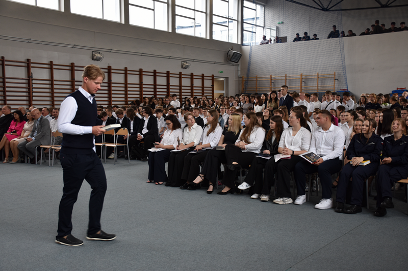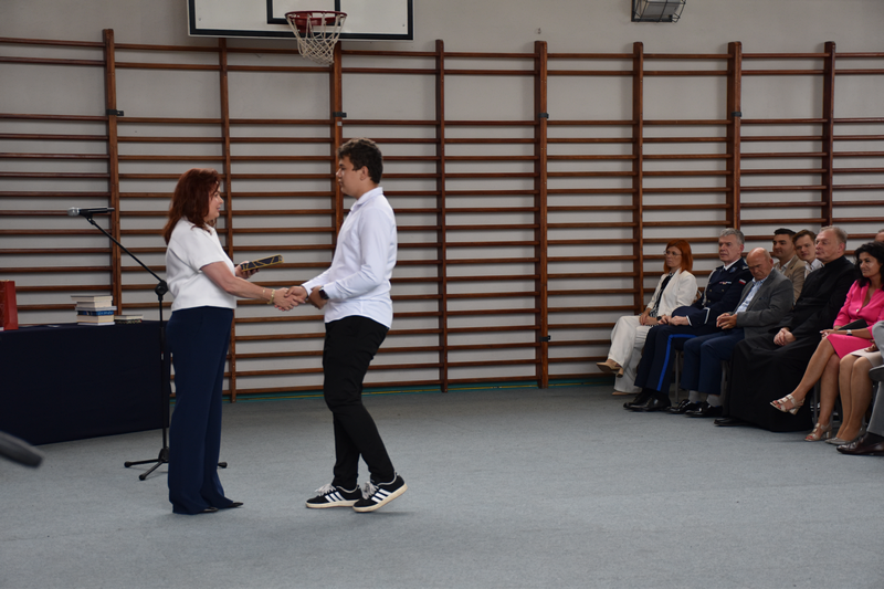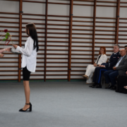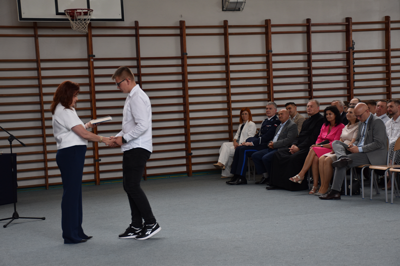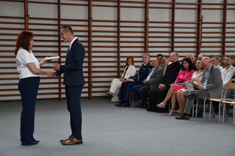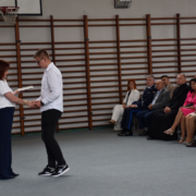 Pan Bartłomiej Kowalczyk- Wicestarosta Białobrzeski złożył gratulacje wyróżniającym się uczniom i ich rodzicom, podkreślając, że warto podejmować wysiłek, gdyż to zawsze procentuje. Życzył wszystkim owocnego wypoczynku w czasie wakacji i urlopu, a także zgromadzenia sił do pracy w kolejnym roku szkolnym. Następnie Pan Starosta wręczył statuetkę najlepszej uczennicy technikum – Patrycji Oktabowicz z klasy 4THR oraz statuetkę dla najlepszego ucznia Branżowej Szkoły I stopnia – Alana Zbiciaka z klasy 1A .