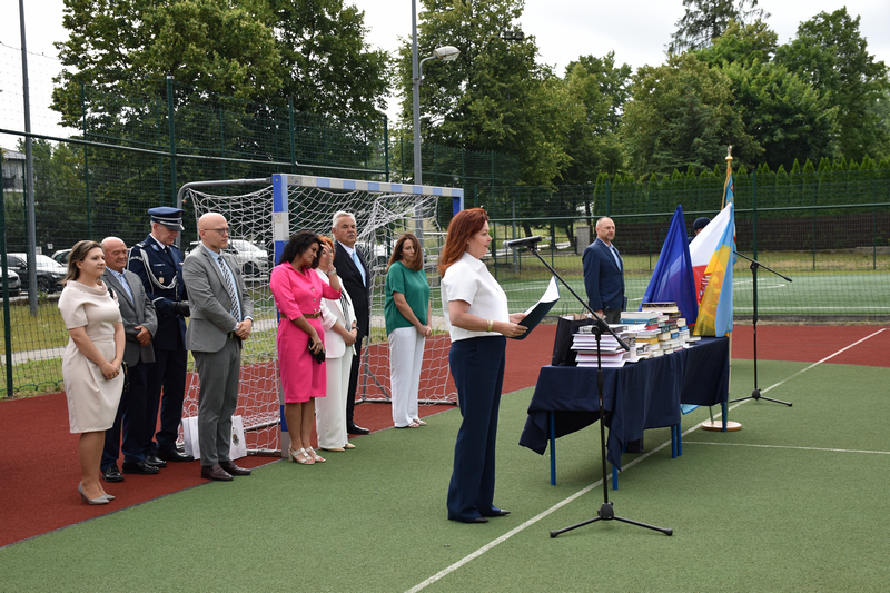 Pani Dyrektor Jolanta Babik serdecznie pogratulowała najlepszym uczniom bardzo dobrych wyników w nauce i wręczyła świadectwa z wyróżnieniem oraz nagrody. Podziękowania skierowała także do nauczycieli i pracowników za oddaną pracę, do Rady Rodziców za wsparcie w działaniach oraz do organu prowadzącego szkołę za dobrą współpracę w mijającym roku szkolnym.