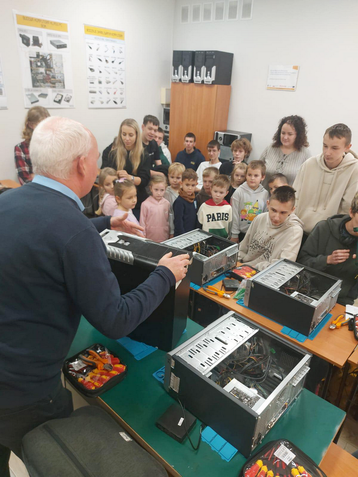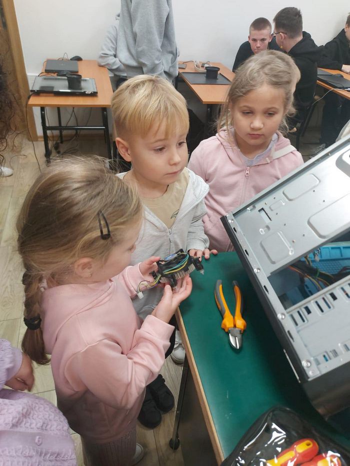 Pod okiem starszych kolegów poznali, co kryje się w środku – płytę główną, pamięć RAM i magiczne kabelki, które sprawiają, że wszystko działa.