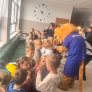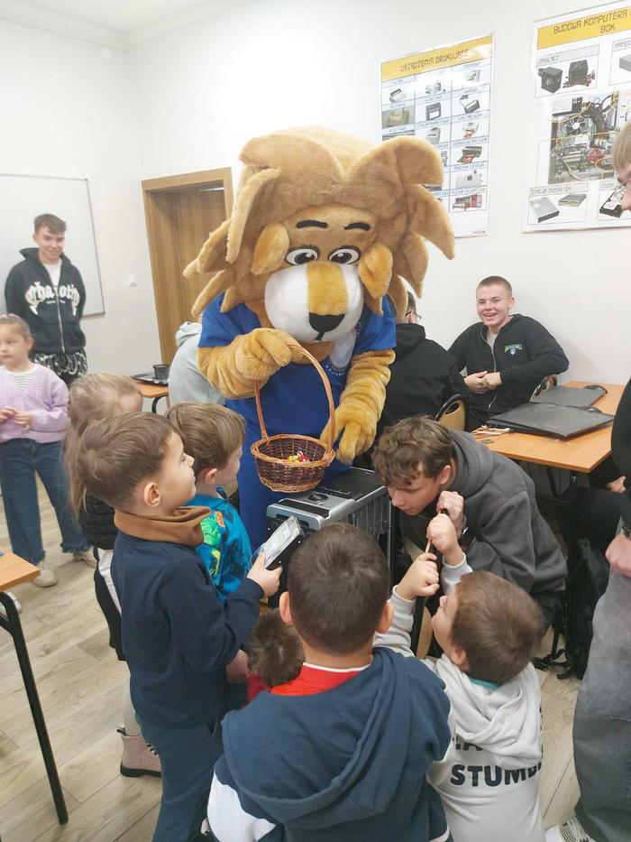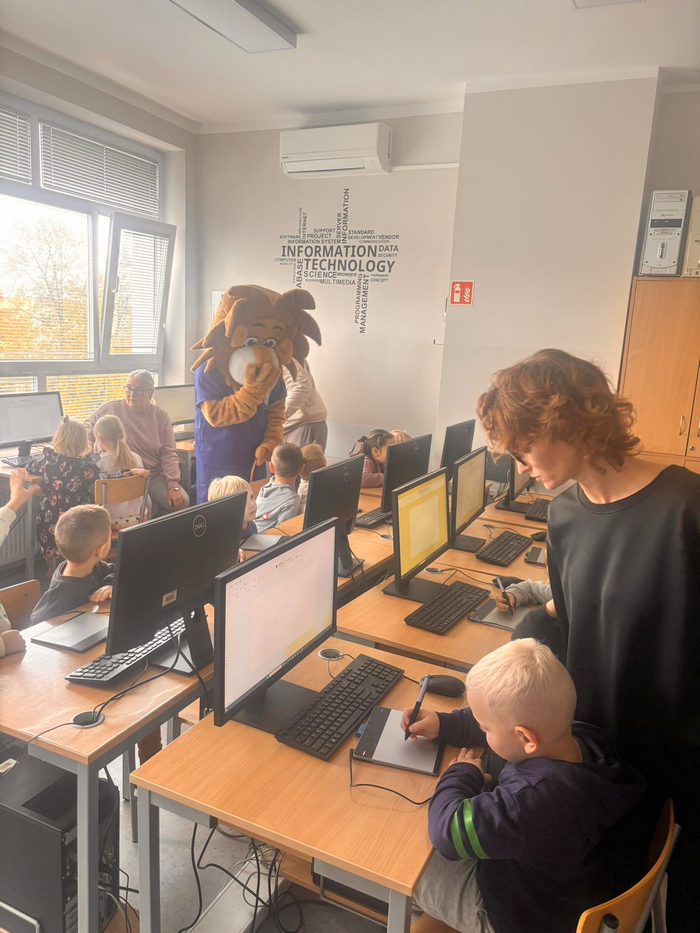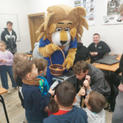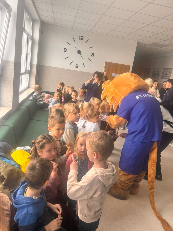 Nasz szkolny przyjaciel Lew Stasiek czuwał nad całą wizytą i oczywiście rozdawał słodkie upominki – bo nauka idzie lepiej, gdy towarzyszy jej uśmiech!