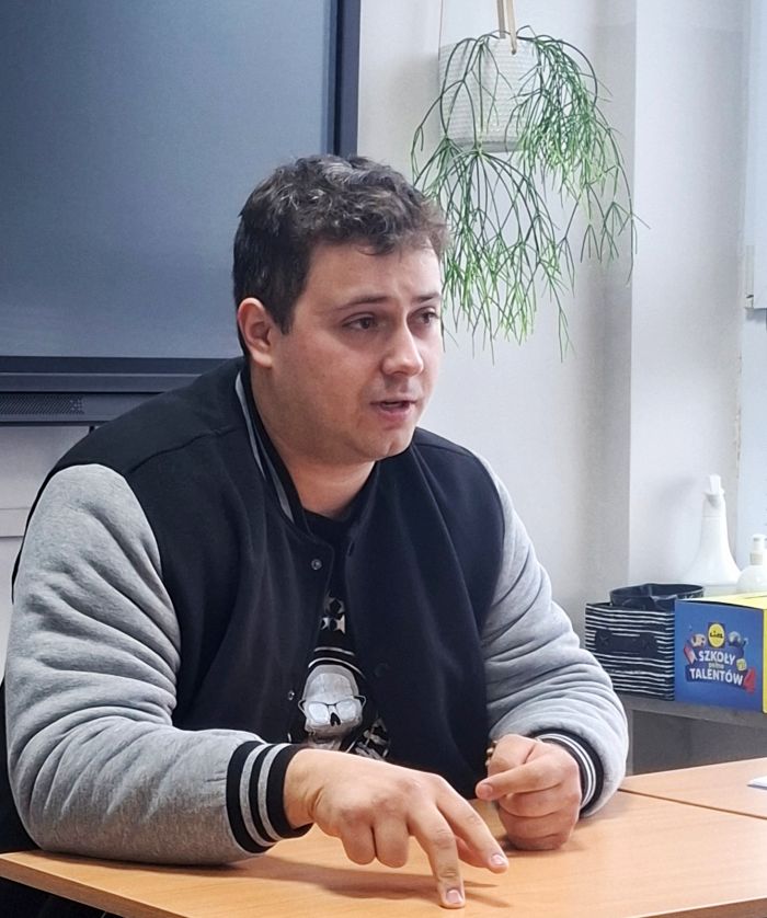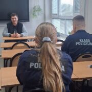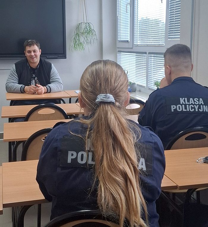 W czasie ostatnich zajęć z Bezpieczeństwa Publicznego, grupę policyjną z klasy 3 TLp, odwiedził nasz absolwent – Hubert Makowski. Zdał wszystkie testy do policji i obecnie służbę pełni w KMP w Radomiu. Z młodszymi koleżankami i kolegami podzielił się swoimi spostrzeżeniami dotyczącymi rekrutacji, testami oraz pierwszymi dniami służby prewencyjnej w Radomiu. Opowiedział o intensywnych szkoleniach sprawnościowych i nauce przepisów prawa. O stawianych przez przełożonych zadaniach i przeprowadzanych interwencjach na terenie Radomia.