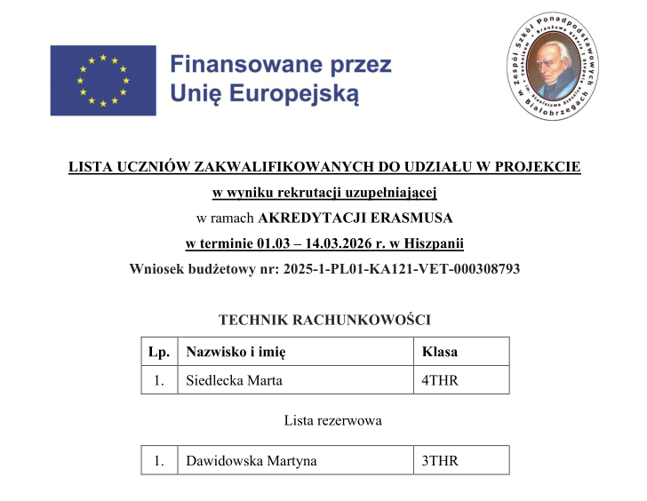 Wyniki rekrutacji uzupełniającej do udziału w projekcie w ramach AKREDYTACJI ERASMUSA