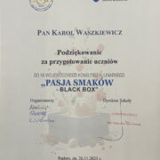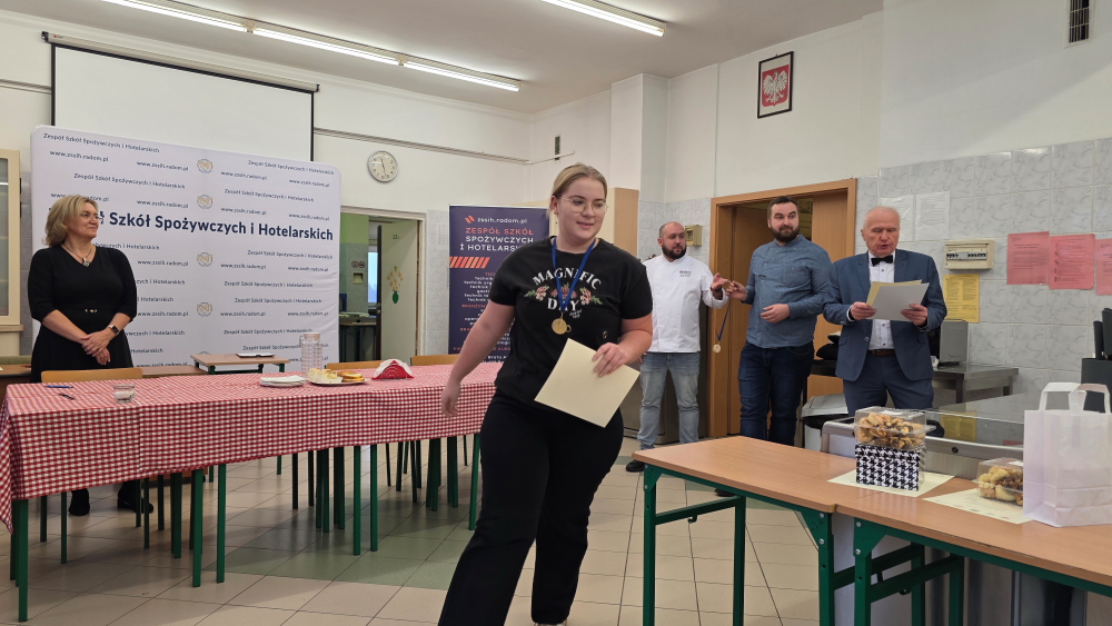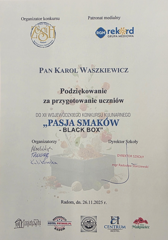 W dniu 26 listopada 2025 r. uczennica naszej szkoły, Agata Woźniak z klasy 2TLŻ, wzięła udział w prestiżowym Wojewódzkim Konkursie Kulinarnym pod hasłem „Pasja Smaków – black box”. Wydarzenie zostało zorganizowane przez Zespół Szkół Spożywczych i Hotelarskich w Radomiu.