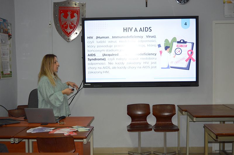 W dniu 16 grudnia w naszej szkole odbyło się spotkanie uczniów klasy 4TL z pracownikiem Powiatowej Stacji Sanitarno-Epidemiologicznej. Tematem prelekcji była profilaktyka HIV/AIDS. Uczniowie dowiedzieli się, czym jest wirus HIV i choroba AIDS, jakie są drogi zakażenia oraz jak skutecznie chronić się przed zakażeniem.