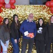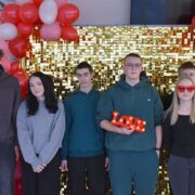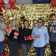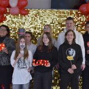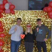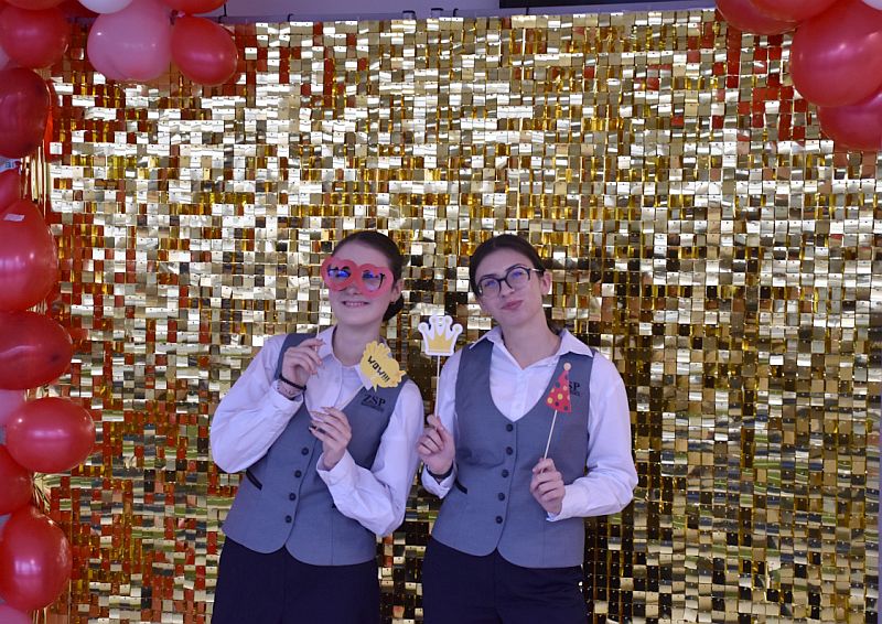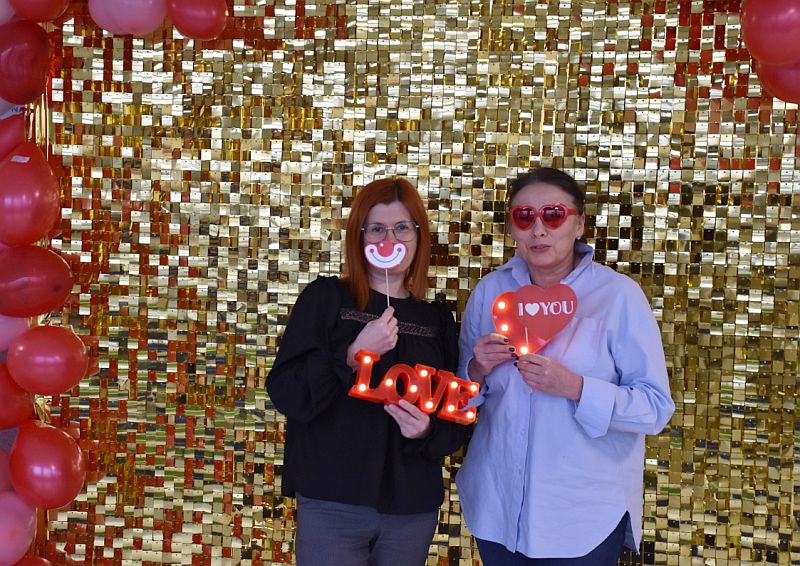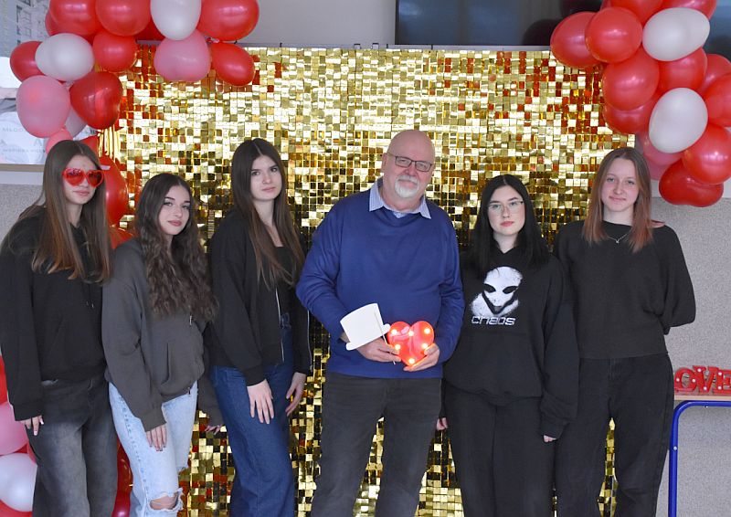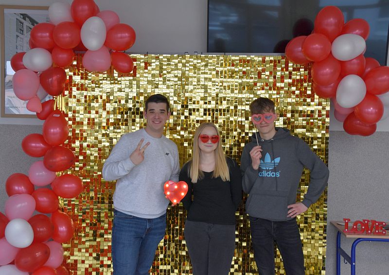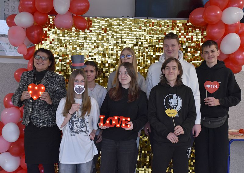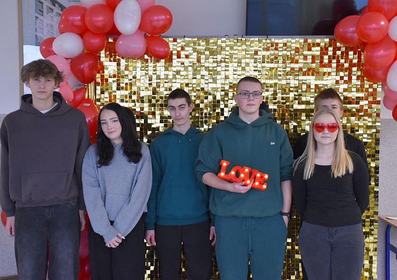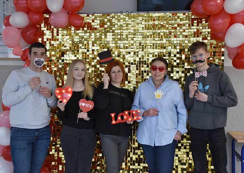 Dodatkową atrakcją była walentynkowa ścianka, przy której można było zrobić pamiątkowe zdjęcia z koleżankami, kolegami i nauczycielami. Kolorowa dekoracja stworzyła wyjątkową atmosferę i zachęcała do wspólnej zabawy.