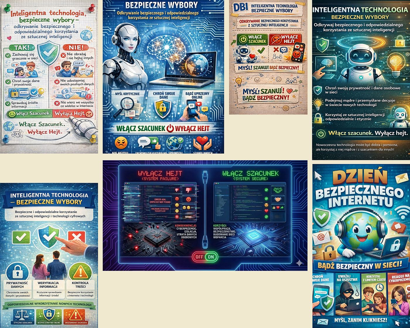 W lutym bieżącego roku odbył się w naszej szkole Konkurs Informatyczny z okazji obchodów Międzynarodowego Dnia Bezpiecznego Internetu 2026. W konkursie wzięło udział ponad 60 uczniów naszej szkoły. Zadanie konkursowe polegało na wykonaniu plakatu w dowolnym programie komputerowym na temat tegorocznego hasła DBI: „Inteligentna technologia, bezpieczne wybory – odkrywanie bezpiecznego i odpowiedzialnego korzystania ze sztucznej inteligencji”. „Włącz szacunek. Wyłącz hejt”.