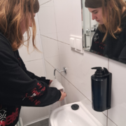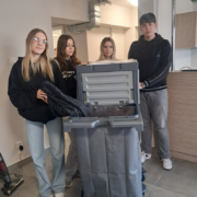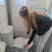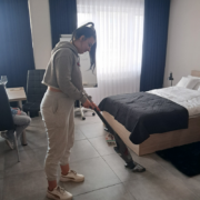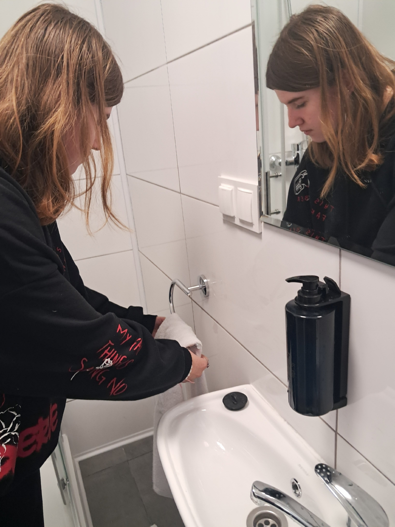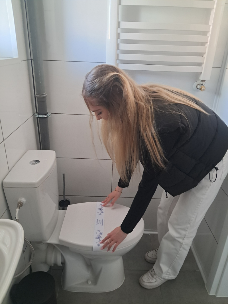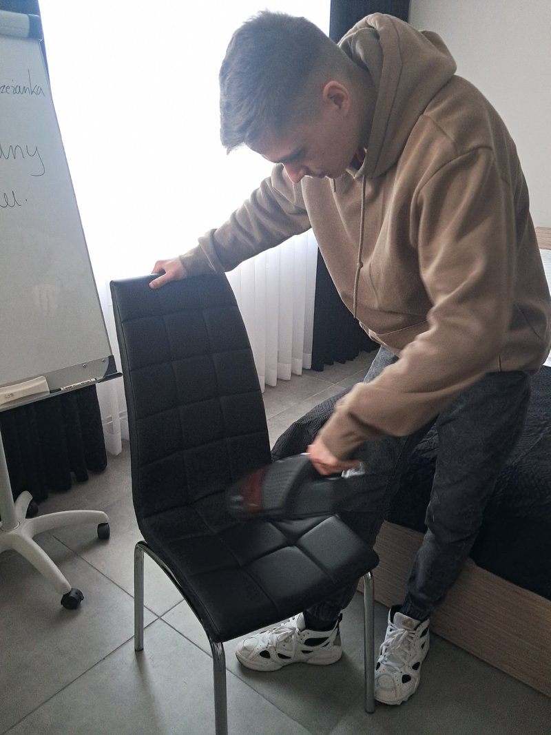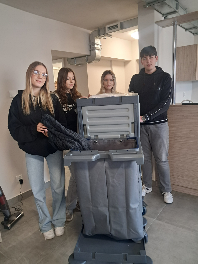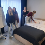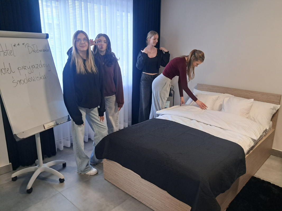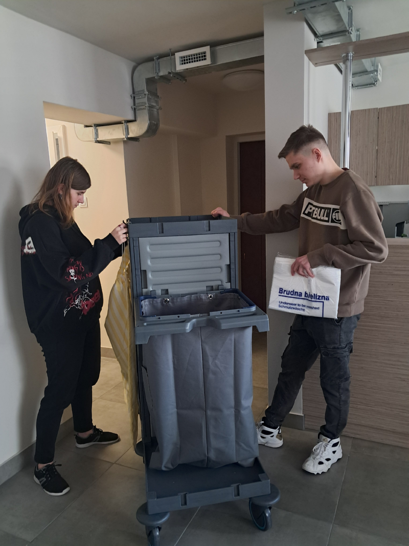 Na zajęciach ze służby pięter wykorzystano nowe sprzęty, ćwiczono umiejętności ścielenia łóżka, składania ręczników i odpowiedniego, higienicznego przygotowania łazienki.