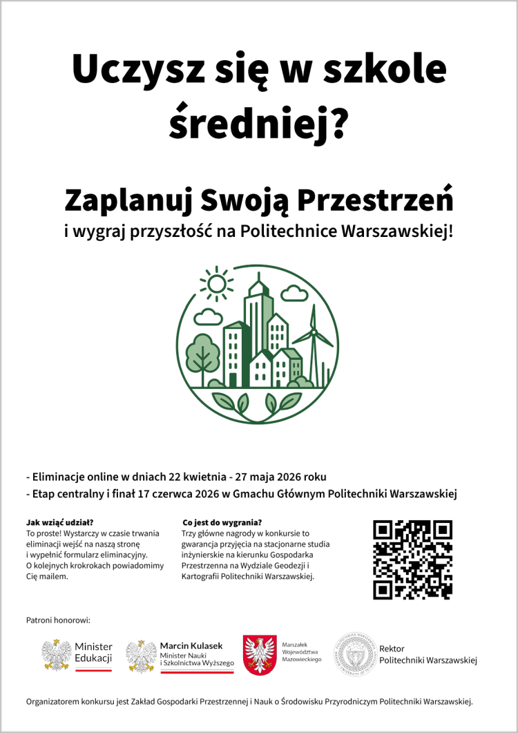 Szanowni Państwo, w tym roku już po raz jedenasty organizujemy w Politechnice Warszawskiej konkurs o indeks na studia na kierunku Gospodarka Przestrzenna. Konkurs skierowany jest do wszystkich uczniów szkół średnich oraz tegorocznych maturzystów, a wzięcie udziału w konkursie jest bardzo proste – wystarczy, że zainteresowani uczniowie wypełnią w dniach od 22 kwietnia do 27 maja 2026 r. formularz eliminacyjny konkursu dostępny na naszej stronie internetowej.