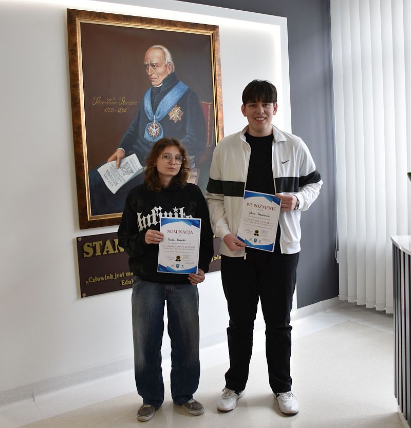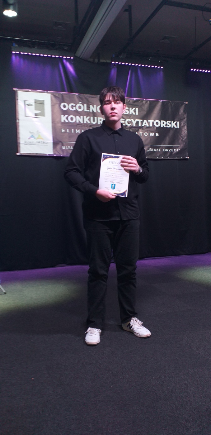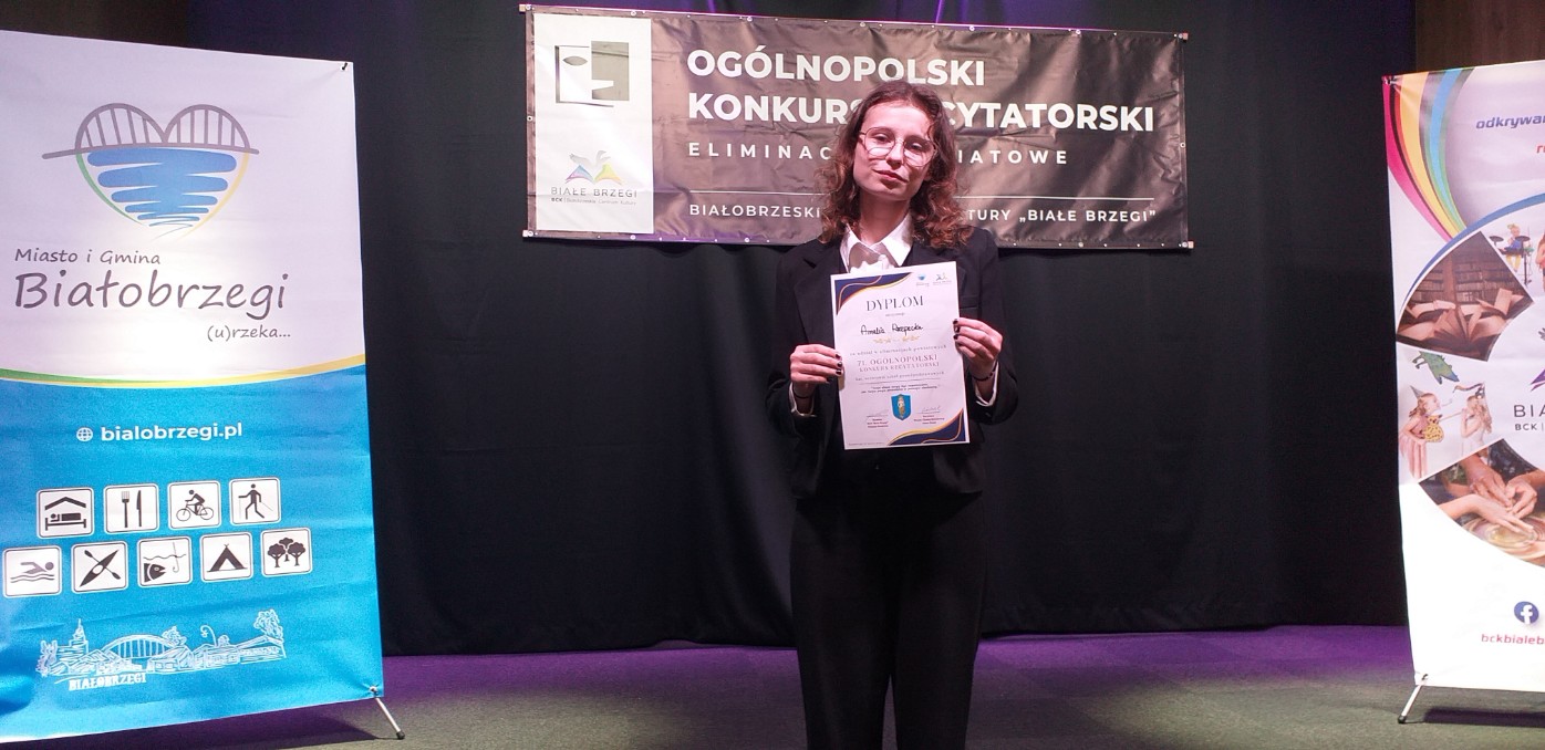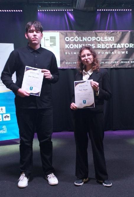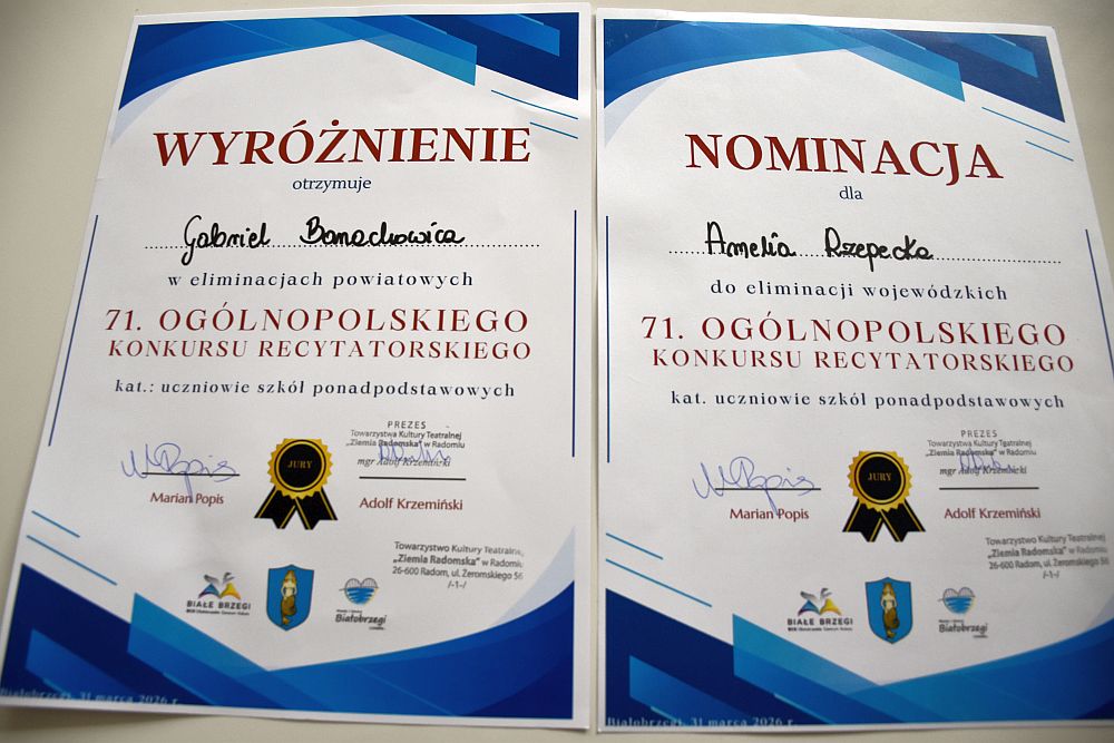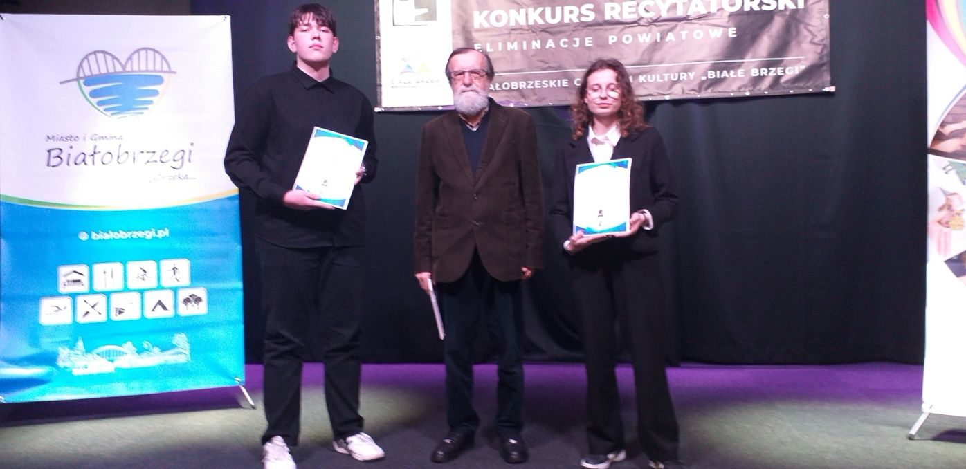 Piękno ojczystego słowa, odpowiednia dykcja i intonacja głosu, a także magia płynące z młodzieńczych serc recytatorów naszej szkoły oczarowały jury w Białobrzeskim Centrum Kultury: „Białe Brzegi” podczas eliminacji powiatowych 71 Ogólnopolskiego Konkursu Recytatorskiego. Zwyciężyła Amelia Rzepecka z klasy 4TLP, prezentując wiersz: „Kiedy umrę kochanie” Haliny Poświatowskiej oraz fragment prozy Thomasa Hardy: „Tessa dUrberville”. Wyróżnienie otrzymał Gabriel Banachowicz z klasy 3THR, recytując „Inwokacje” z „Pana Tadeusza” Adama Mickiewicza i fragment: „Wesela w Atomicach” Sławomira Mrożka. Nad odpowiednim akcentem i barwą głosu recytatorów czuwały Panie: Monika Śliwa i Katarzyna Marchewka.