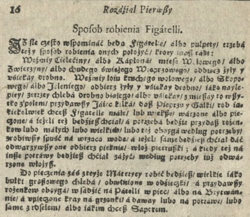 Okładka i przepis na Figatelle z „Compendium ferculorum, albo zebranie potraw” autorstwa Stanisława Czernieckiego.