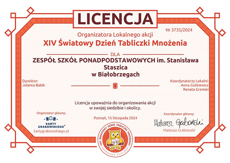 Społeczność ZSP im. Stanisława Staszica w Białobrzegach zmierzyła się z tym zadaniem na lekcjach matematyki, fizyki oraz na stronie organizatora ŚDTM – zdając egzamin online, zdobywając tytuł EXPERTA.
