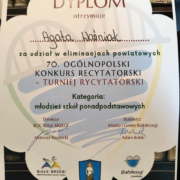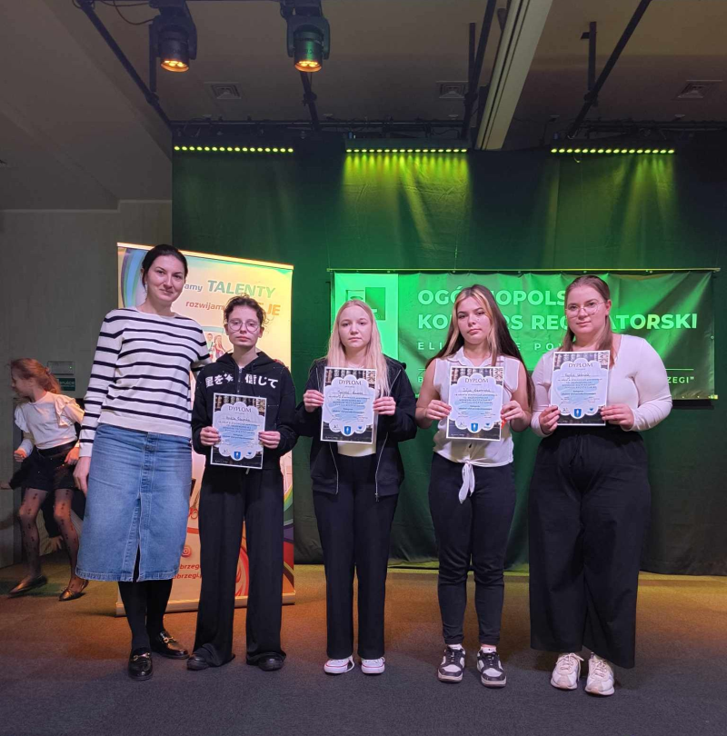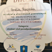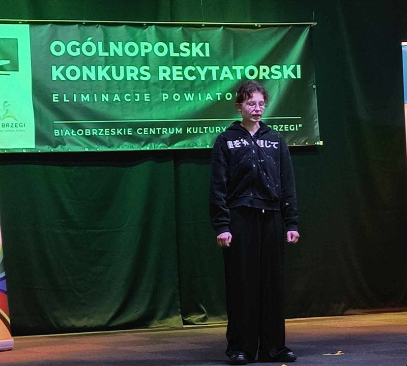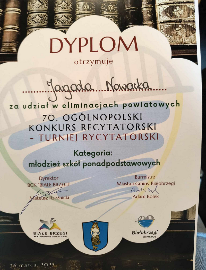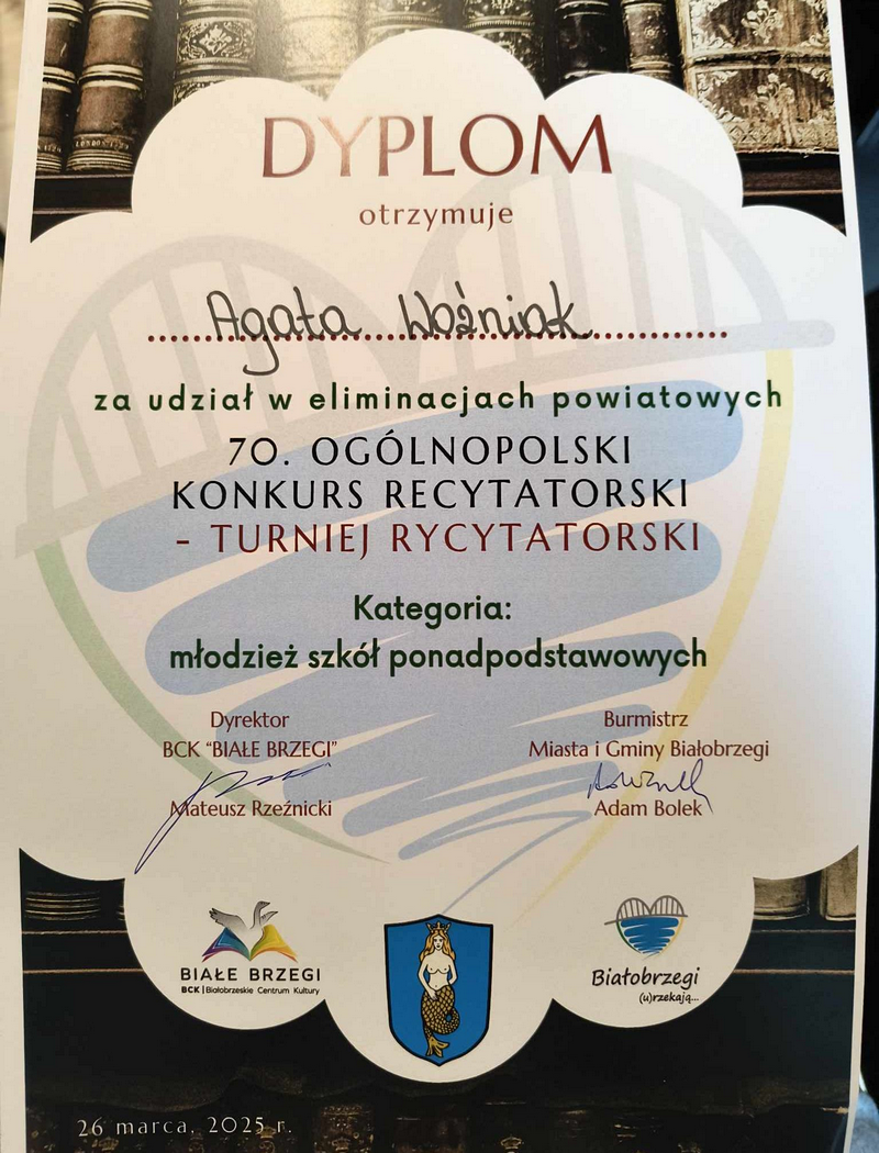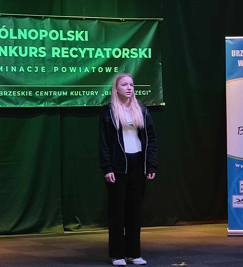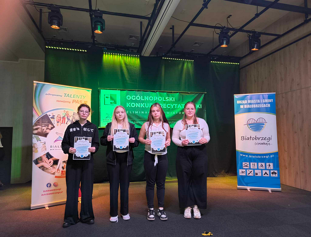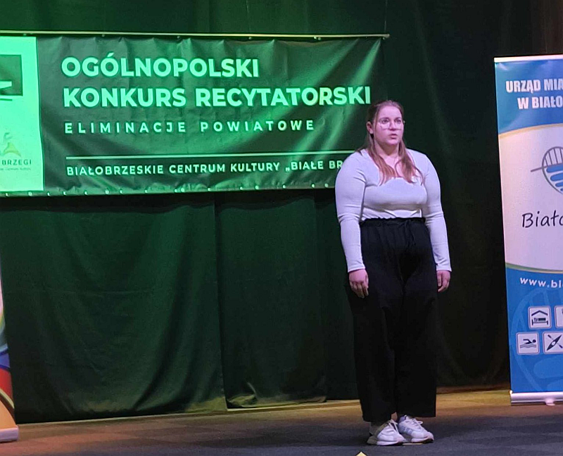 W dniu 24 marca 2023r. w sali konferencyjnej Urzędu Miasta i Gminy Białobrzegi odbyły się eliminacje do 68 Ogólnopolskiego Konkursu Recytatorskiego, których organizatorem było Białobrzeskie Centrum Kultury BIAŁE BRZEGI oraz Urząd Gminy Białobrzegi. Naszą szkołę reprezentowały cztery uczennice: Maria Błońska z kl. IV TŻEp, przygotowana przez panią Monikę Śliwę, Justyna Czapska z kl. IV TLHp, Patrycja Woźniak z kl. II THR oraz Julia Wójcik z kl. IV TLHp –przygotowane przez panią Katarzynę Kot. Wyróżnienie otrzymała Julia Wójcik z kl. IV TLHp, a do dalszego etapu Turnieju Recytatorskiego zakwalifikowano Marię Błońską z kl. IV TŻEp.