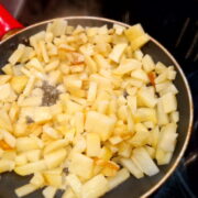 - Jabłka obrać, pokroić na ćwiartki, wykroić gniazda nasienne. Każdą ćwiartkę położyć na desce i pokroić na cienkie plasterki o grubości ok. 2 mm. Z pokrojonych jabłek wybrać najmniejsze plasterki i włożyć je do garnka (w sumie ma być odłożonych 1/3 wszystkich jabłek). Z odłożonych jabłek zrobimy mus, który wyłożymy na kruchy spód.