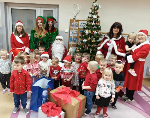 A oto nasi Wolontariusze w akcji! Jak co roku, grupa uczniów wcieliła się w role elfów i Świętego Mikołaja, aby umilić przedszkolakom mikołajkowe świętowanie.